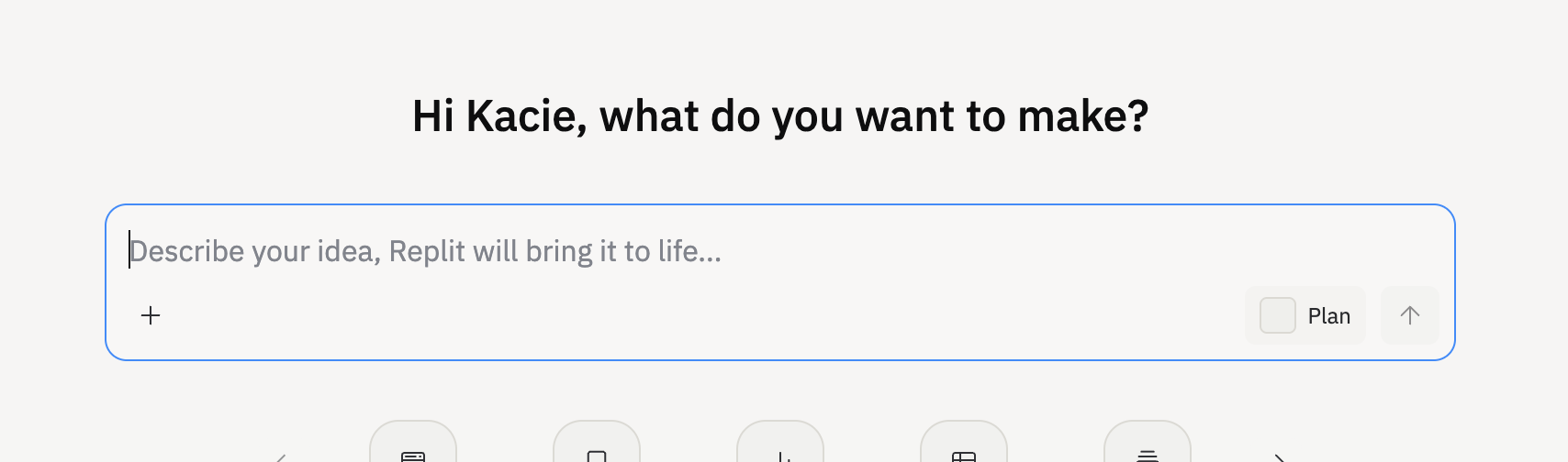 This prompt is Replit Agent. When you type your idea here, Replit creates a new Repl and its AI starts building your app. No terminal, no template picker. Just describe what you want.
