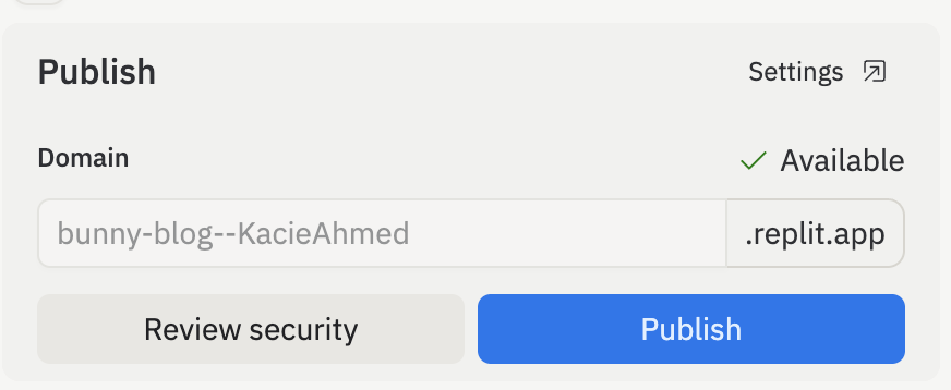 When it's done, look for the Domain field in the Publishing dashboard. That's your live URL. It'll look something like https://your-repl-name--yourusername.replit.app. Click the copy icon and share it.