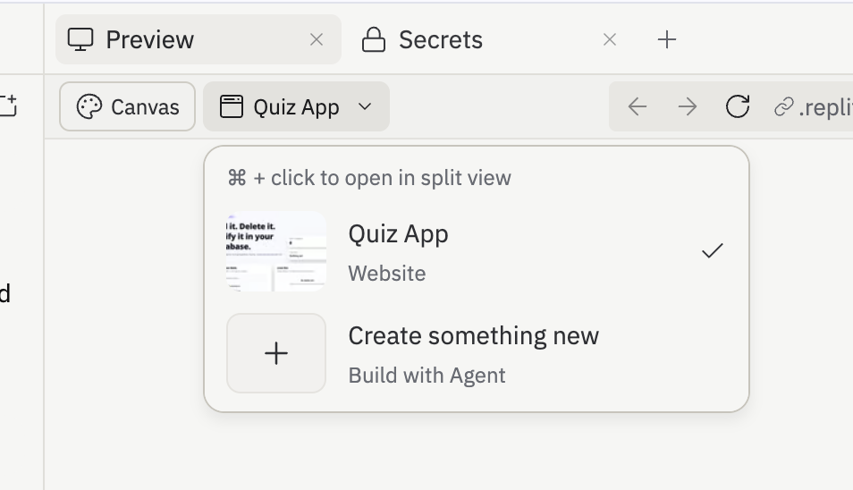 - Click the project name dropdown in the top bar of the preview (next to the Canvas button).