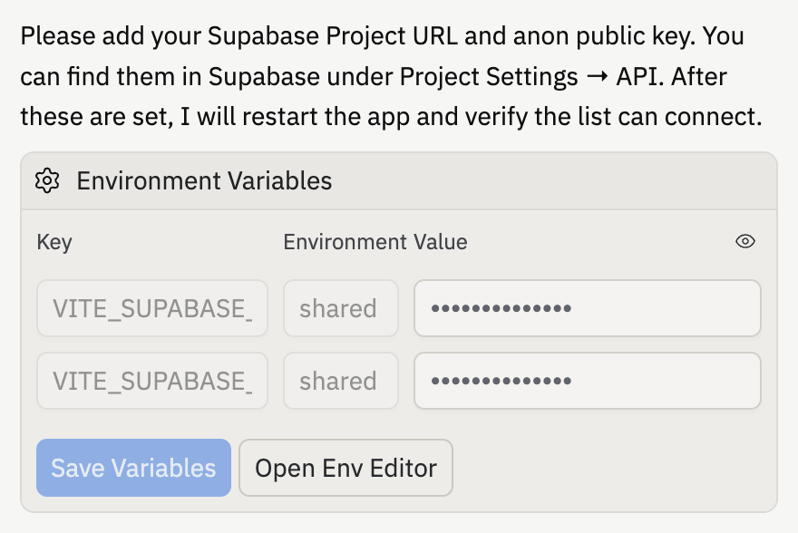 you're responsible for wiring `SUPABASE_URL` → whatever name
