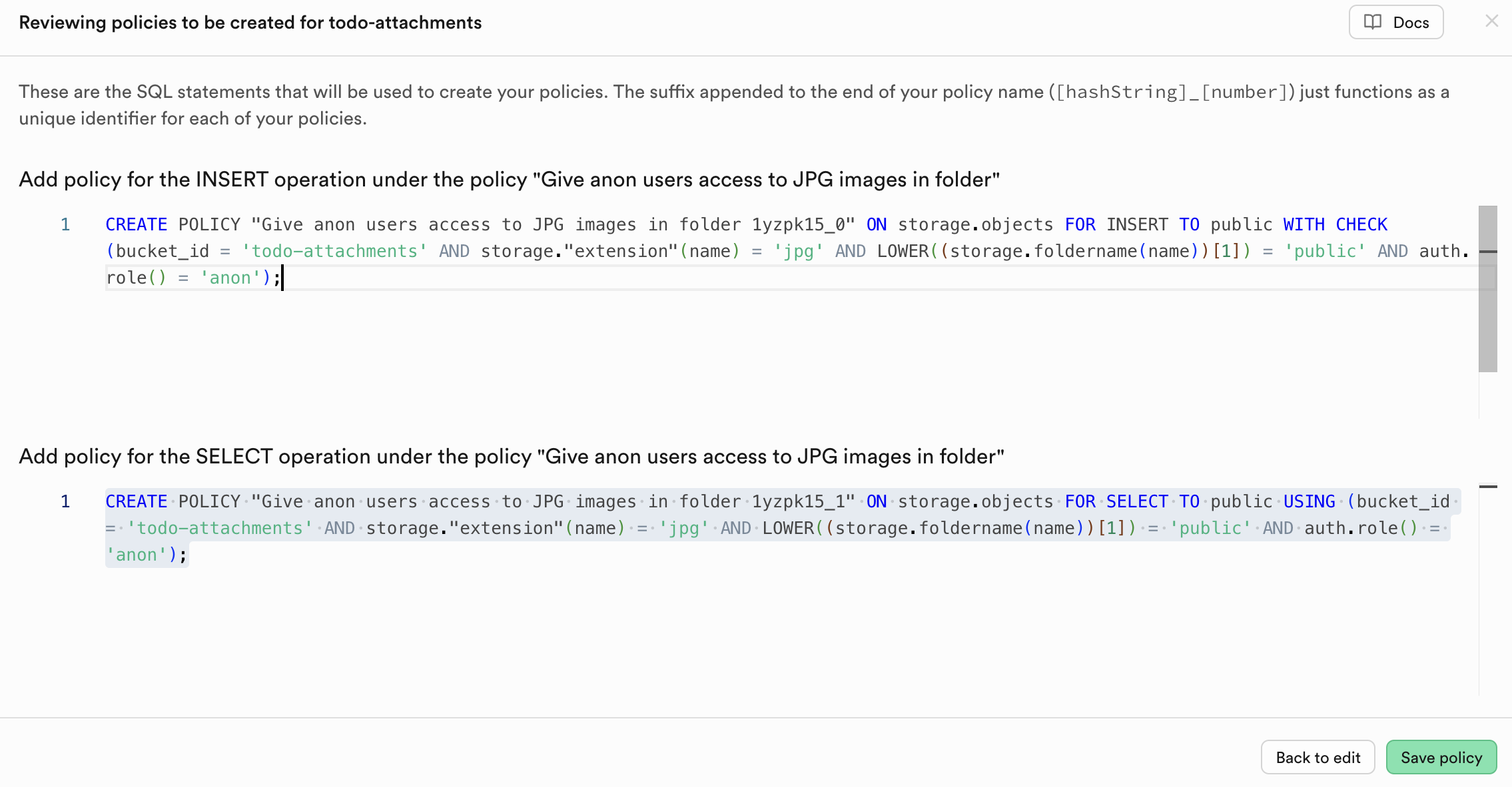 Click Save policy. Supabase shows a review screen with the exact SQL it'll run for each operation you picked: